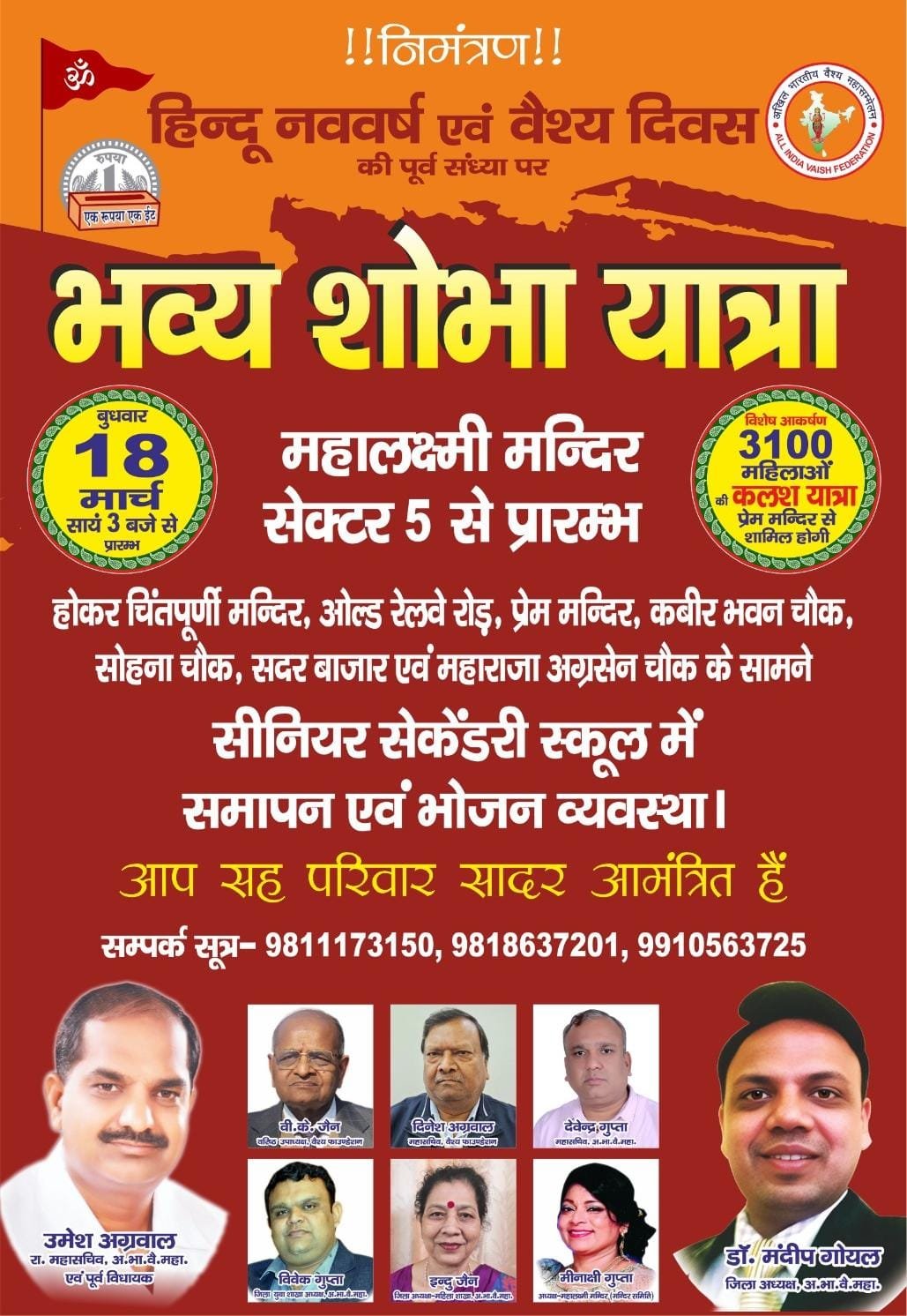 हिंदू नववर्ष एवं वैश्य दिवस के पावन अवसर पर आयोजित भव्य शोभा यात्रा में आप सभी सपरिवार सादर आमंत्रित हैं।